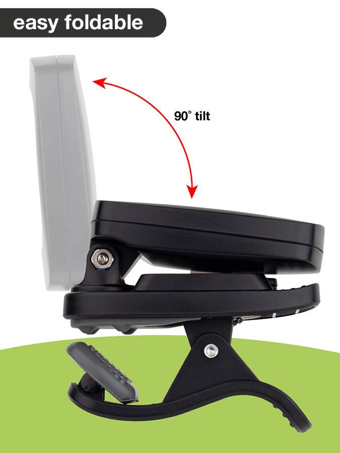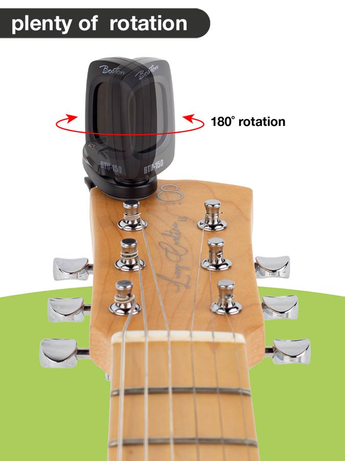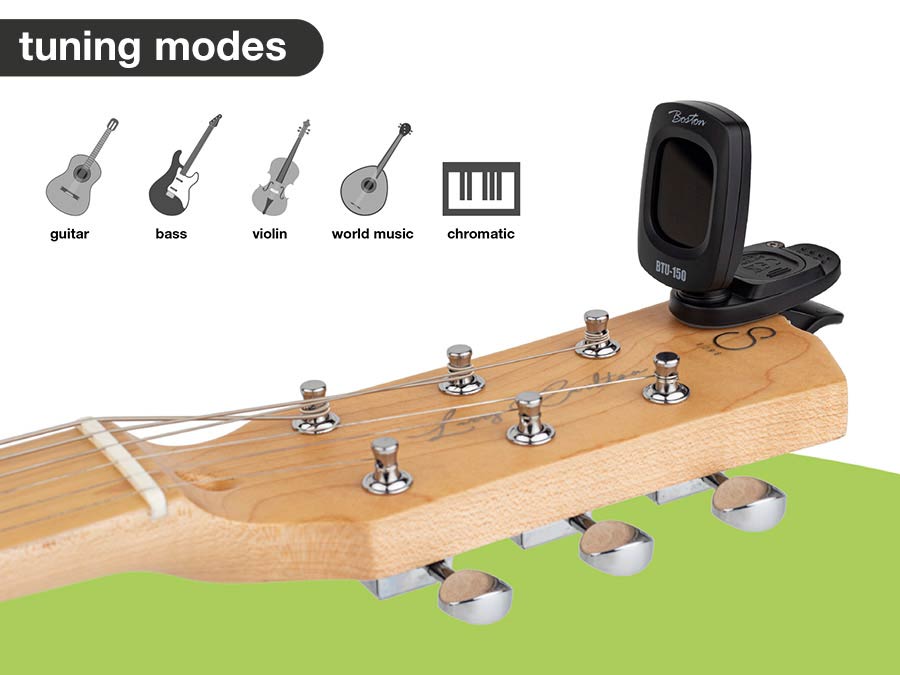 Artikelnummer: BTU-150 Produkt-ID: 37425 Chromatischer Clip-Tuner mit mehrfarbigem Display und automatischer Ein-/Ausschaltung Der BTU-150 schaltet sich automatisch ein, sobald er am Gitarrenkopf befestigt wird, und wieder aus, sobald er entfernt wird. Ist Ihr Instrument gestimmt, leuchtet die Hintergrundbeleuchtung GRÜN. Ist es zu hoch gestimmt, leuchtet sie ROT, und ist es zu tief, leuchtet die Anzeige ORANGE. Der BTU-150 schaltet sich nach 5 Minuten Nichtbenutzung automatisch ab. Integrierter Piezosensor für präzises Stimmen.