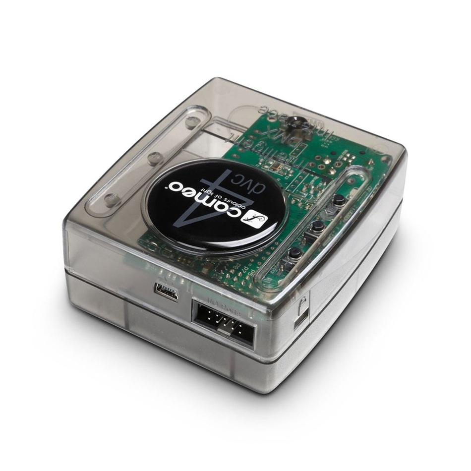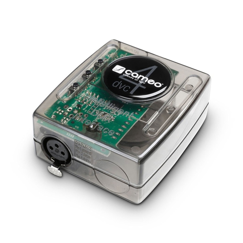 Mit dem Cameo DVC 4 Interface und der zugehörigen D 4 Software lassen sich DMX-kompatible Lichtgeräte komfortabel vom PC und Mac steuern. Im Live-Modus bietet die Plug-and-Play-Schnittstelle 512 DMX-Kanäle, zum computerlosen Einsatz als Standalone mit 256 Kanälen können programmierte Lightshows in den integrierten Flash-Speicher kopiert werden. Das Interface besitzt einen Mini-USB-Port als Eingang, einen 3-poligen DMX-Ausgang und wird über den USB-Ausgang des Computers mit Spannung versorgt. Drei Taster ermöglichen die Programmauswahl und Dimmen im Standalone-Modus, für den ein handelsübliches 5V USB-Netzteil benötigt wird.