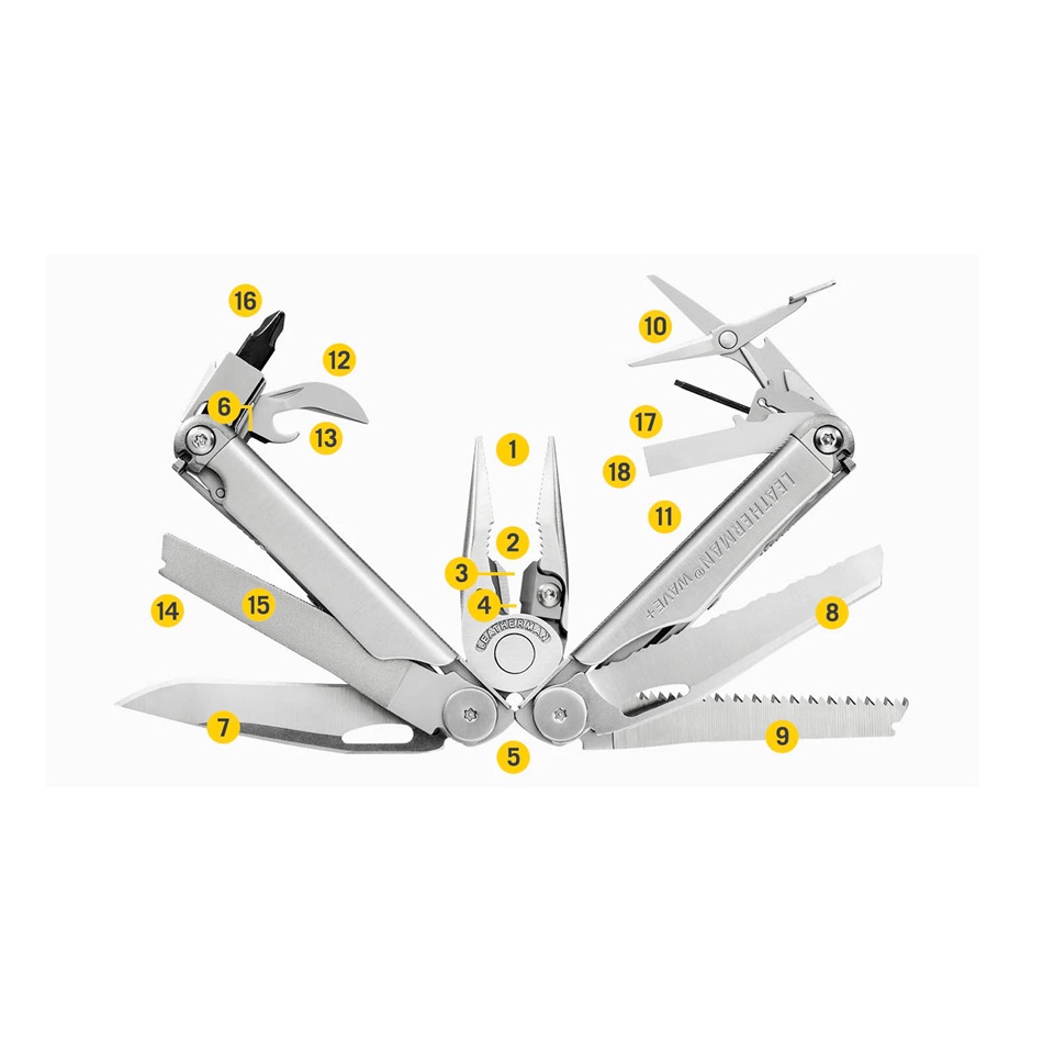 Der internationale Bestseller Wave+ hat alle wichtigen Tools für den Alltag und dazu außerdem einen auswechselbaren, widerstandsfähigen Drahtschneider. Alle 18 Tools lassen sich schnell und einfach aus- und einklappen, um jede Aufgabe zu meistern. Viele der Tools sind von außen zugänglich, also lassen sie sich auch benutzen, wenn das Multi-Tool zusammengeklappt und geschlossen ist. Taschenclip separat erhältlich.